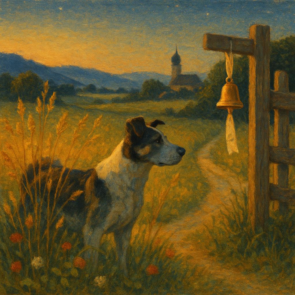 Fable’s tail seemed to wake first, a thump in grass, then his spine tugging him forward, then the careful lift of paws became a trot that his joints protested and he ignored. He reached her at the old fence line where the posts leaned like tired horses. The gate leaned too, as if the prairie had been telling it bedtime stories for years. The bell, small and brass, was looped on a nail where Ruth’s hand had always left it. Her hand cupped it now, palm warm under metal warmed by sun that was gone.