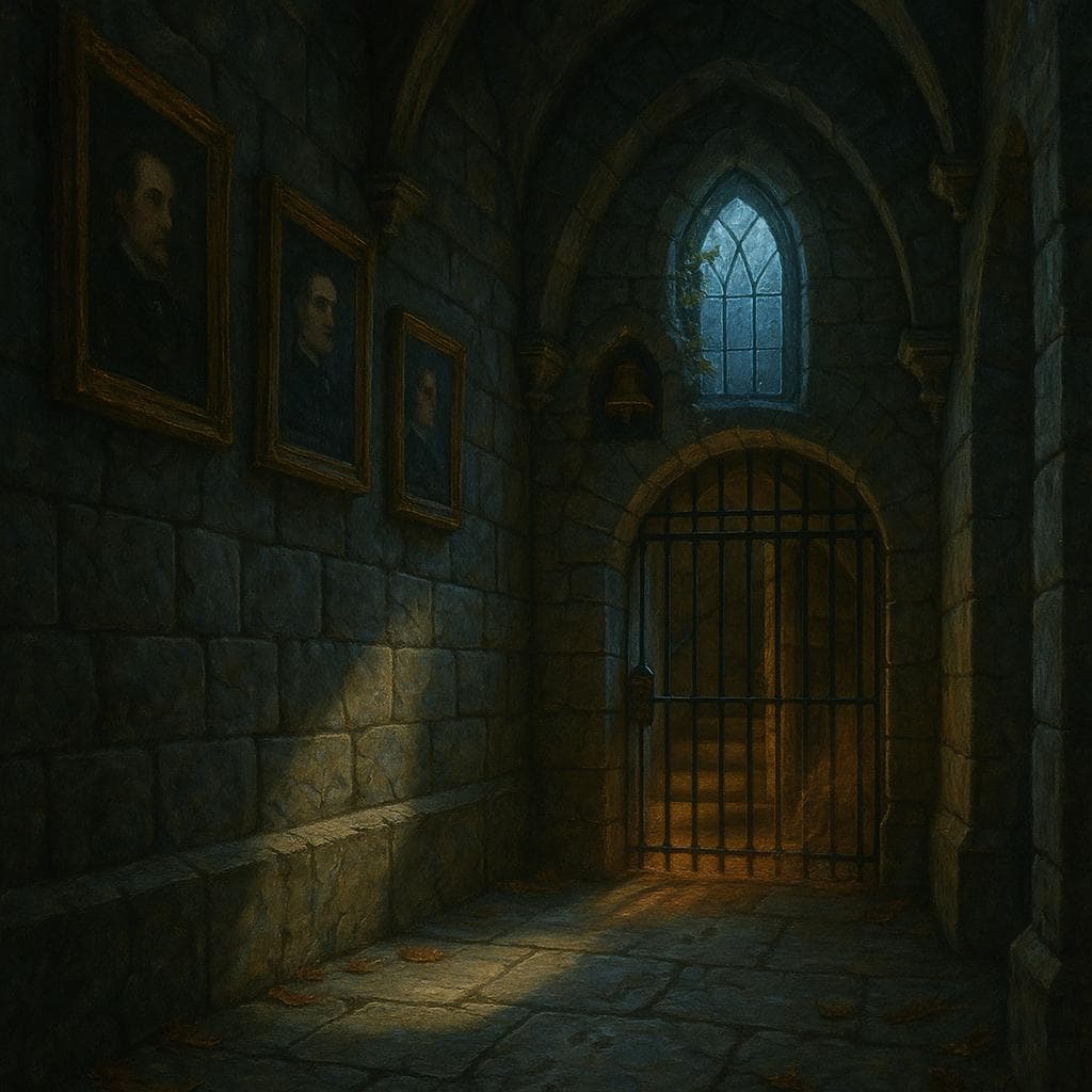 The bells rang again—twice now—and, far up where the moon had been, morning laid itself across the ruined windows. Light found the chapel, turned the dust to gold, and ran cool fingers over the iron that had barred me. The gate unlaced its teeth. The portraits, for once, looked somewhere else.