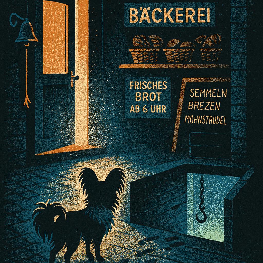 Frost clung to the cobbles as Pip, a fifteen-year-old Papillon, nosed along Maple Street. His hips ached, but the scent was wrong, like metal and rain before a storm. The town had gone quiet after midnight, yet the bakery door stood ajar and the bell rope had been cut. He remembered chasing crumbs there as a pup. He slipped inside, ears pricked. Flour dust shimmered, pawprints circled the counter, not human, not dog. They stopped at the cellar. From below came a clink and a breath that smelled of river moss. Pip crept down.