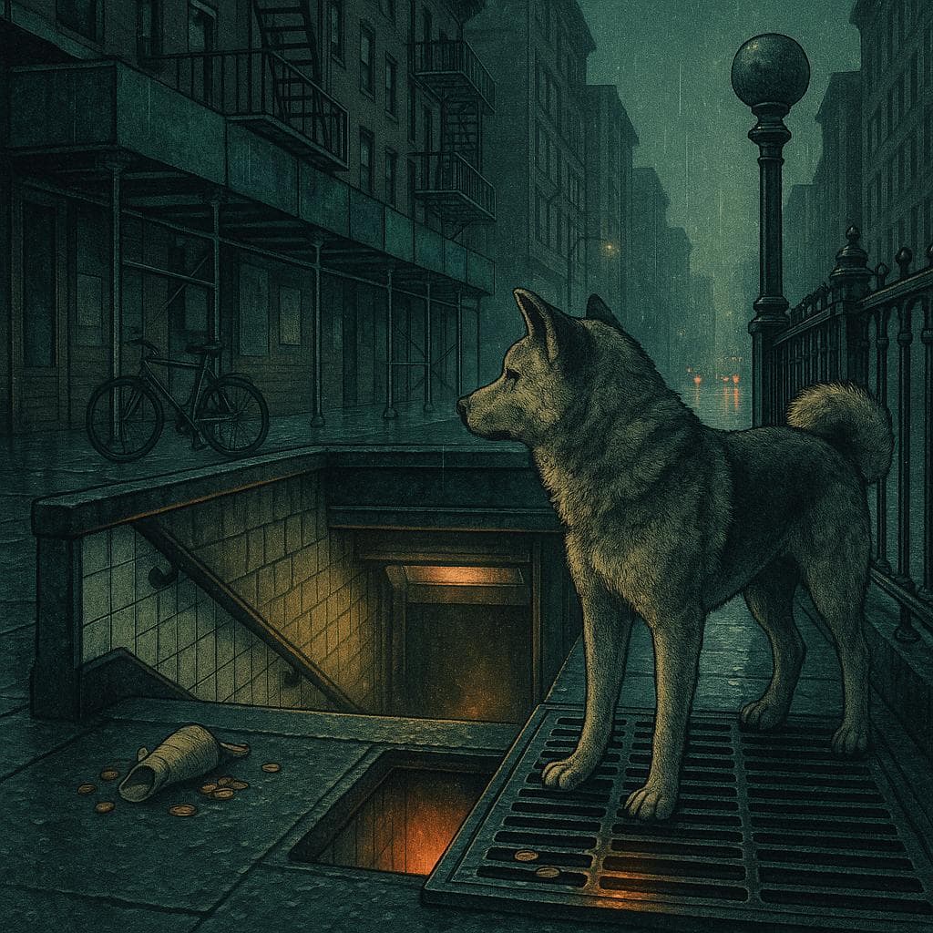 Keen lights stained the rain on Eighth Avenue as Ishiro, a fifteen year old Akita, threaded the crowd. He remembered snowfields in his first home, yet moved with city patience, reading the air. A courier burned with late fear. A violinist measured hope. Their scents braided into a quiet truth he understood. From a subway grate rose hot metal, pennies, and almonds. Fire. He turned, old bones steady, and drew toward the steps no one noticed. Far below, a small voice called for a mother. The tiles shivered. The lights cut out. The grate under Ishiro’s paws began to lift.