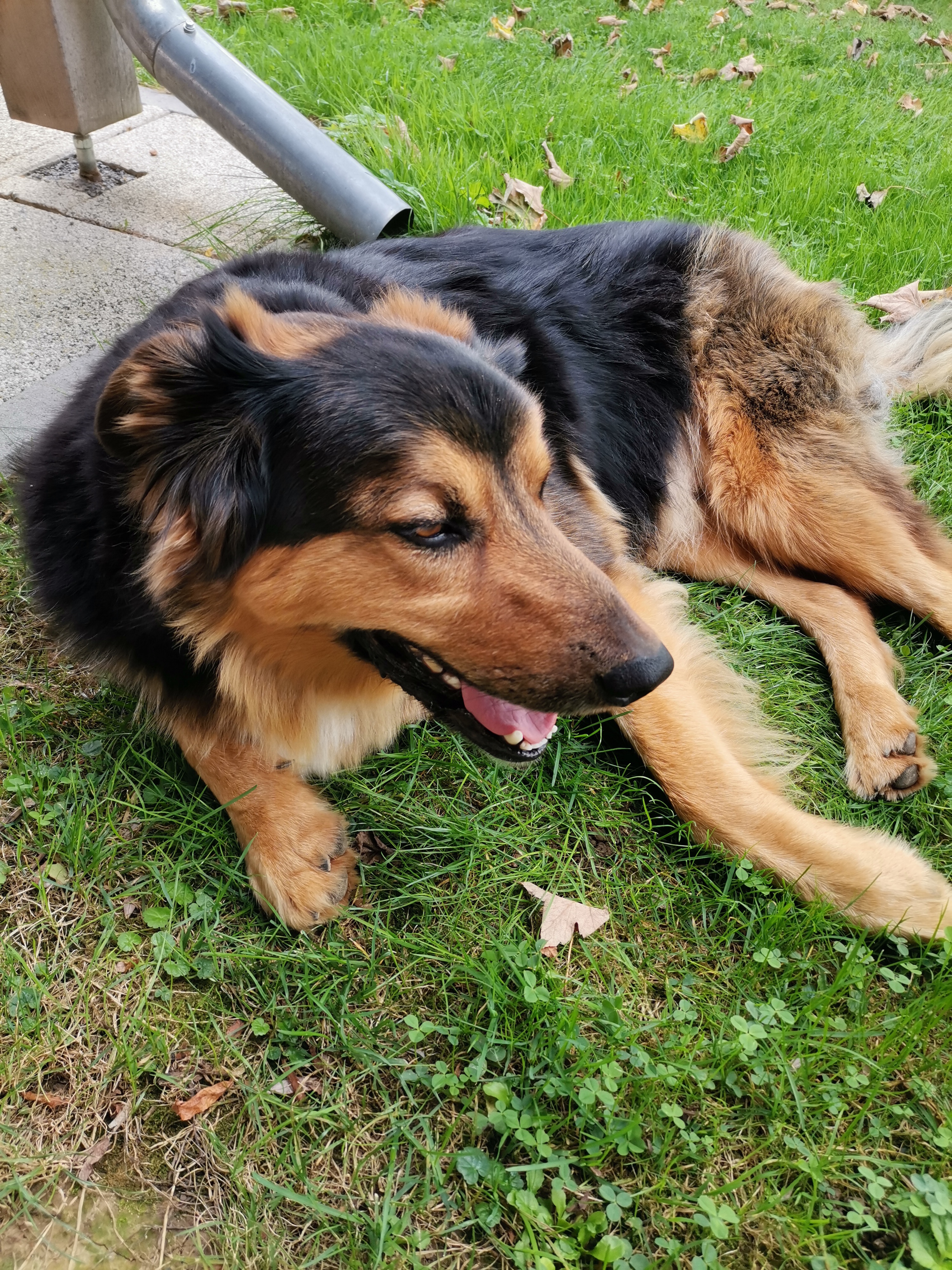 Die Gesichtsform sowie die sanft wirkenden Augen und das leicht gewellte Fell an Ohren und Beinen deuten auf einen Golden Retriever-Anteil hin. Auch die generell freundliche Ausstrahlung sowie der harmonische Körperbau sind Hinweise darauf.