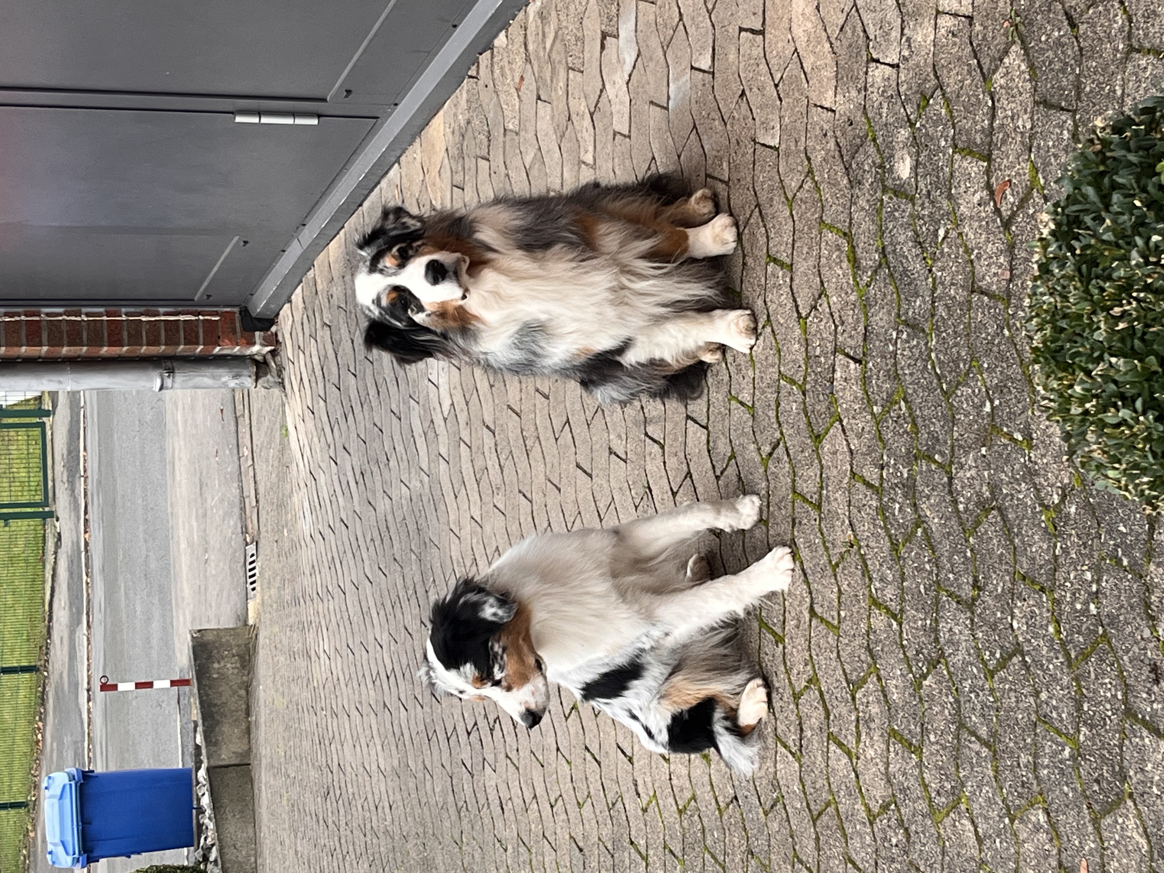 Beide Hunde weisen sehr typische Merkmale des Australian Shepherds auf: mittellanges, dichtes Fell mit einer auffälligen Merle-Färbung (insbesondere Blue Merle), weiße Abzeichen an Brust und Pfoten, kupierte oder natürlich kurze Rute sowie die aufrechte Haltung. Auch die Kopfform und die Ohrenformation sind charakteristisch für diese Rasse.