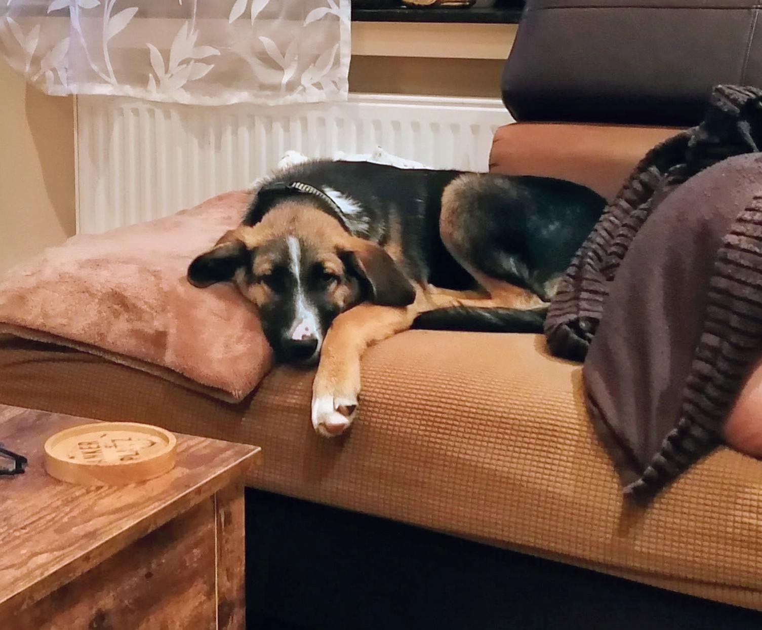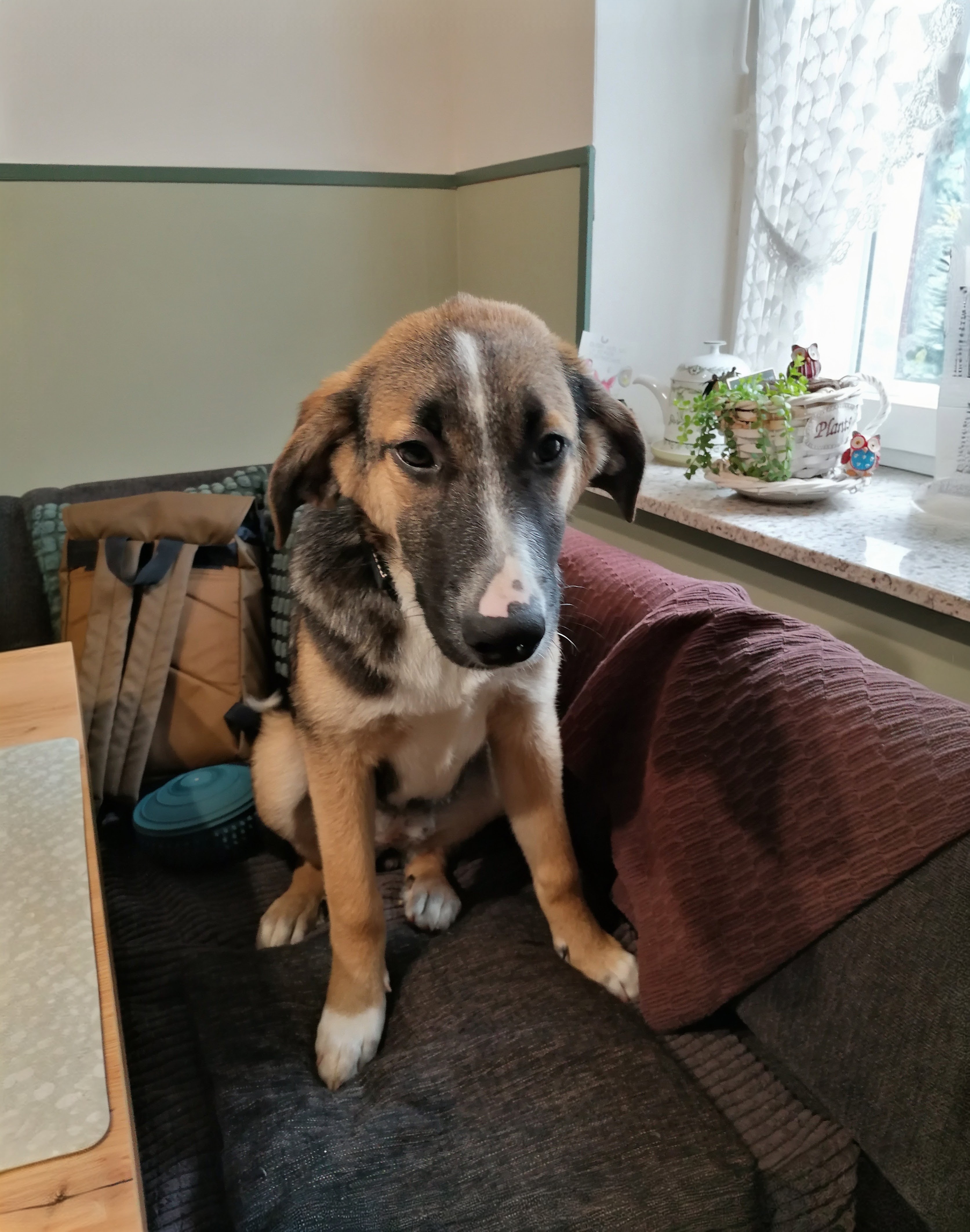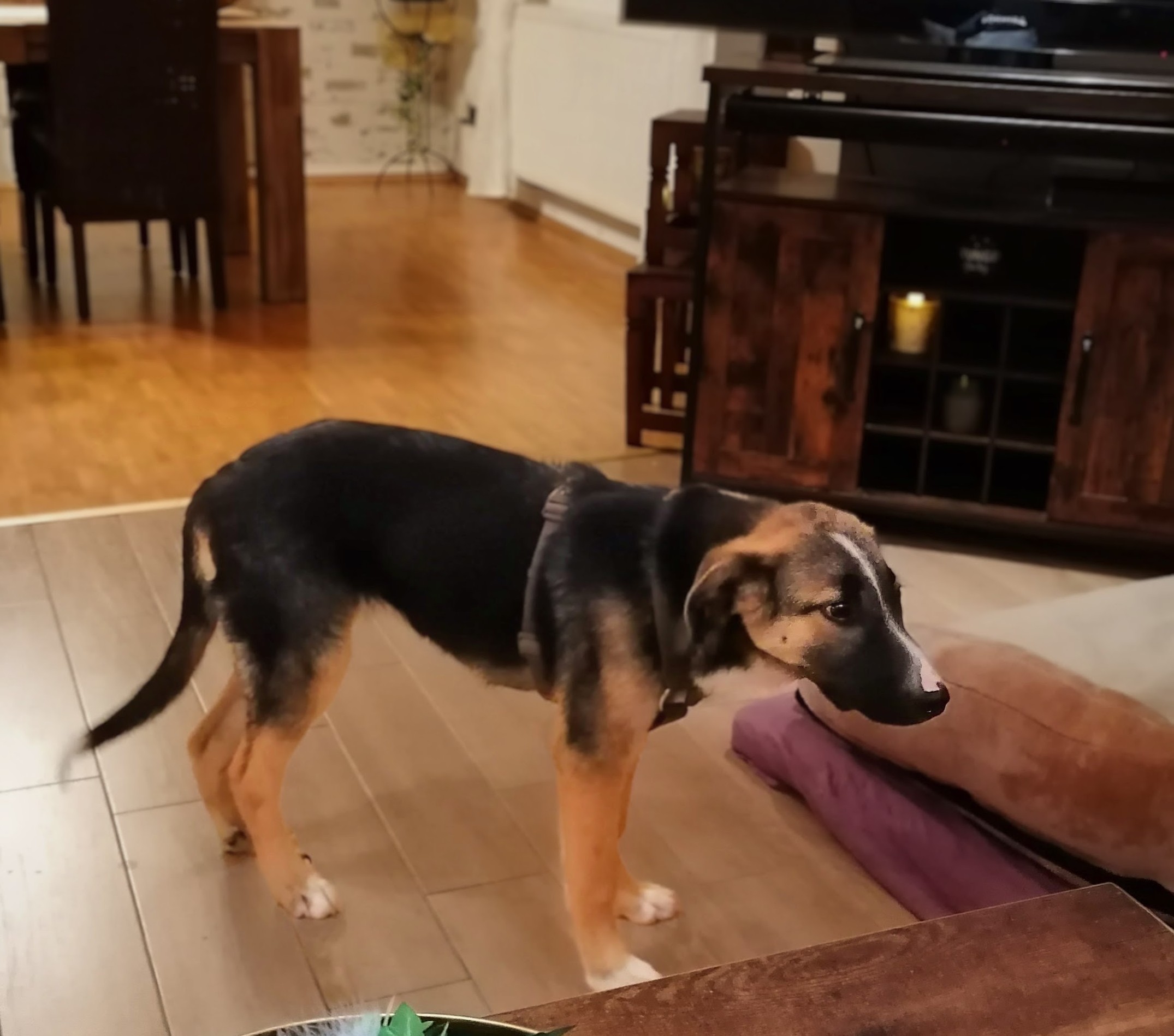 Die Körperform, insbesondere die lange, gerade Rückenlinie und die leicht abfallende Kruppe, sowie das schwarze Deckhaar und das braune Fell an den Beinen und unter dem Bauch, ähneln stark dem klassischen Erscheinungsbild eines Deutschen Schäferhundes. Auch die großen aufmerksamen Augen und das ausgeprägte Verhalten sprechen für diese Rasse.
