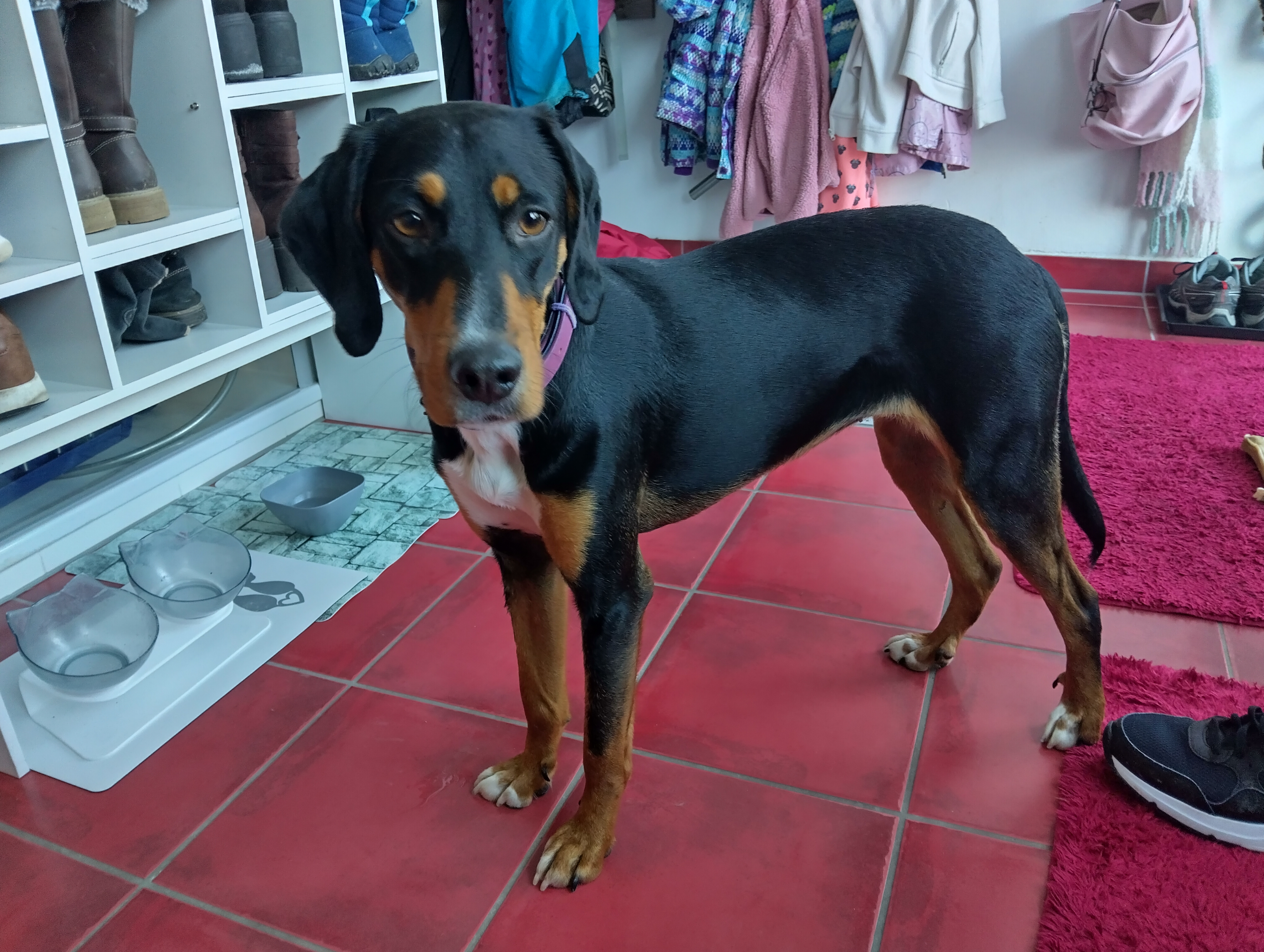 Die lange, schmale Schnauze und die zierlichere, hochbeinige Körperstruktur deuten auf eine Laufhundart hin, besonders den Schweizer Laufhund (z. B. Berner Laufhund). Diese Rasse ist in der Region verbreitet und wird häufig mit Sennenhunden gekreuzt.