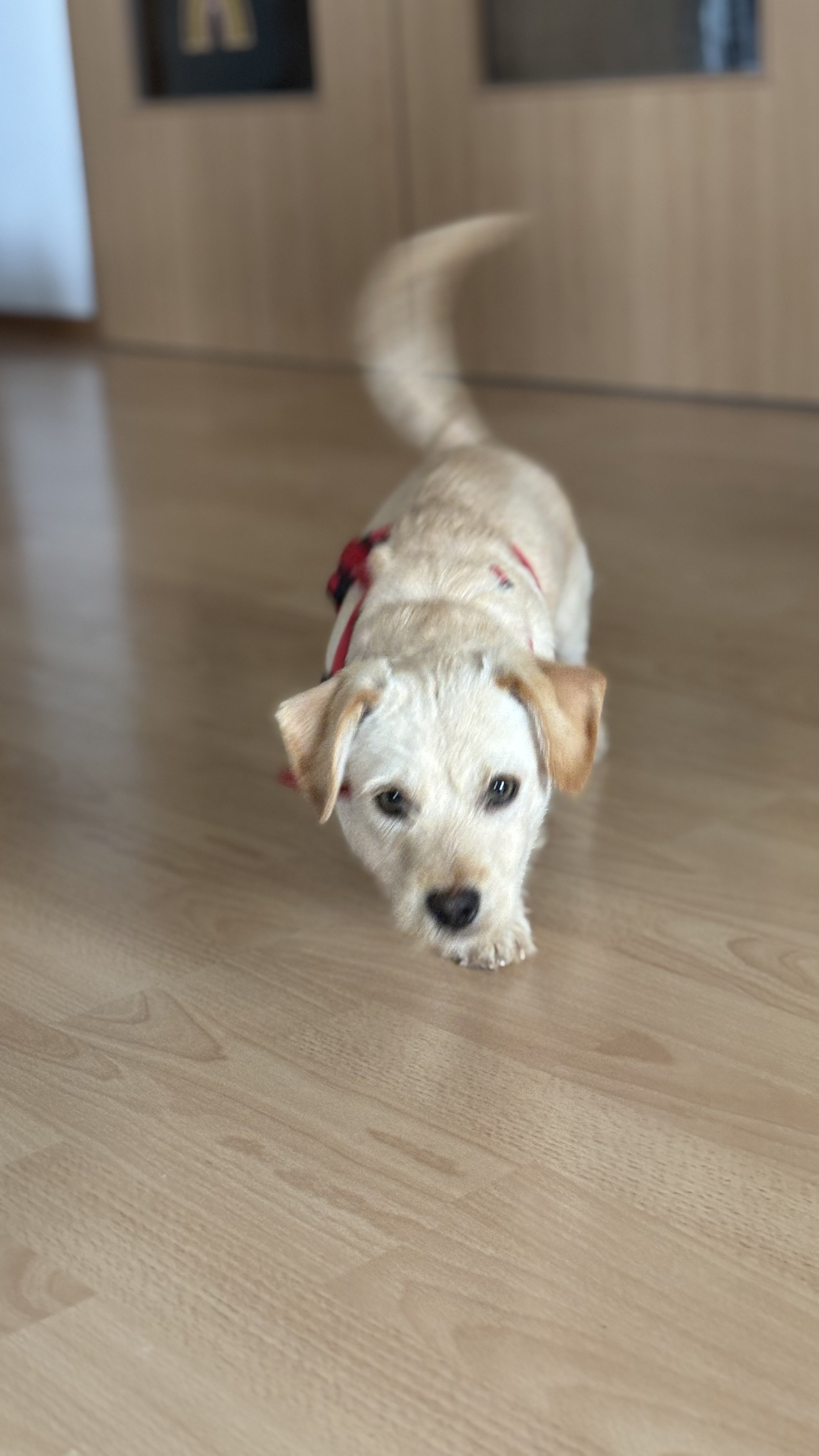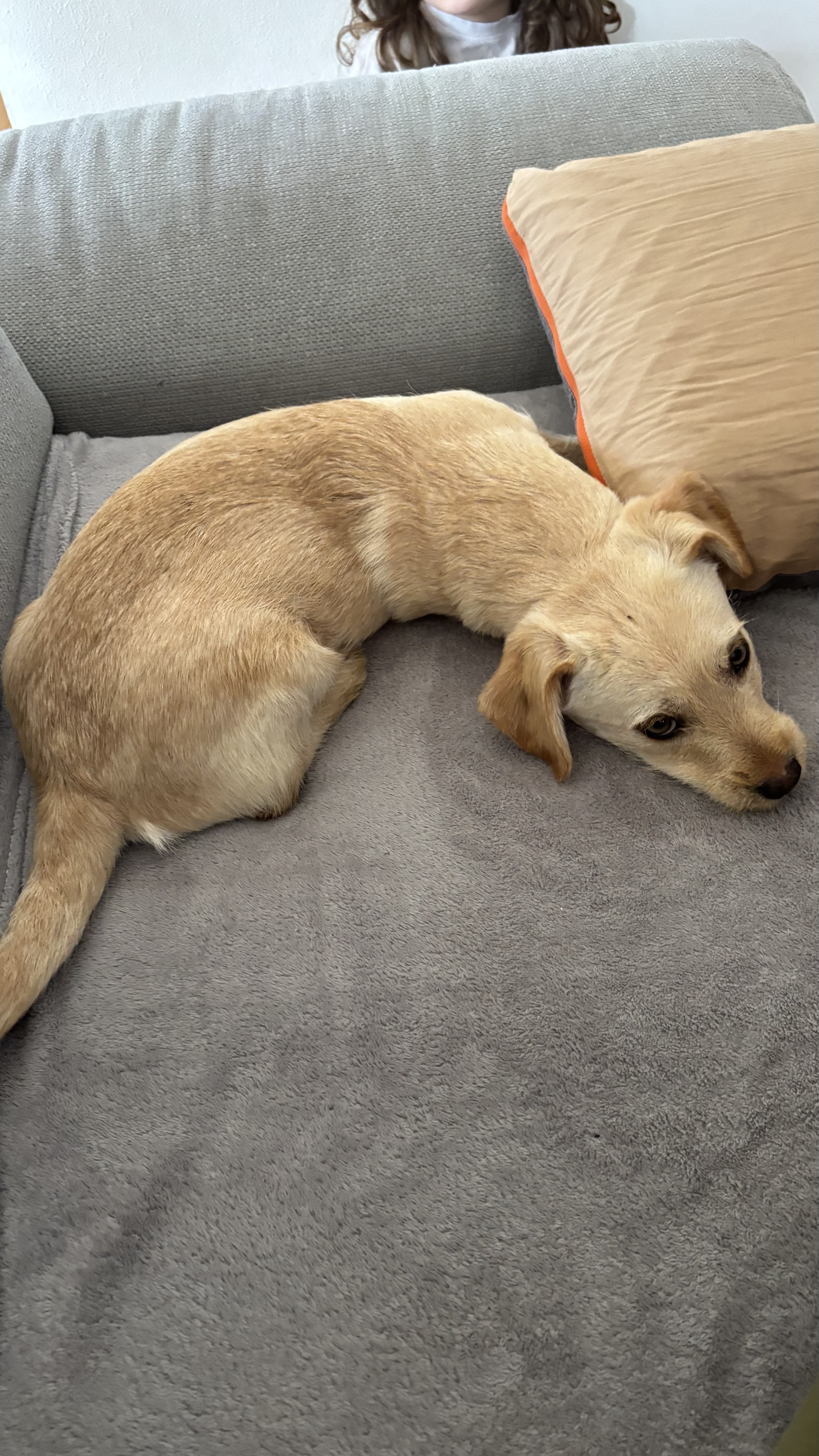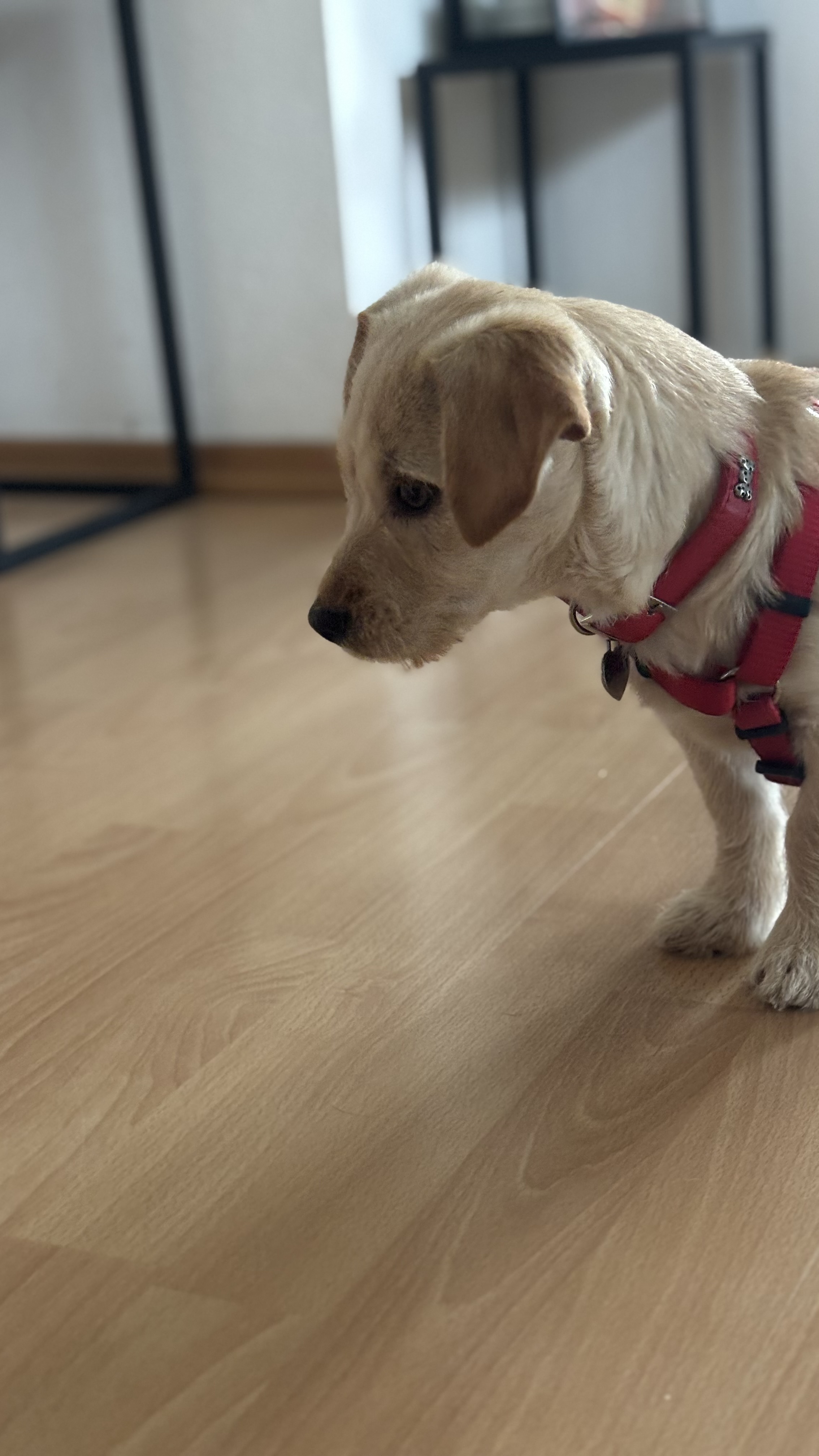 Die Fellfarbe (helles Beige/Creme), die Ohrenform und die entspannte, freundliche Ausstrahlung lassen auf einen Labrador-Anteil schließen. Auch der Körperbau zeigt einige weichere, rundlichere Konturen, die typisch für den Labrador sind.
