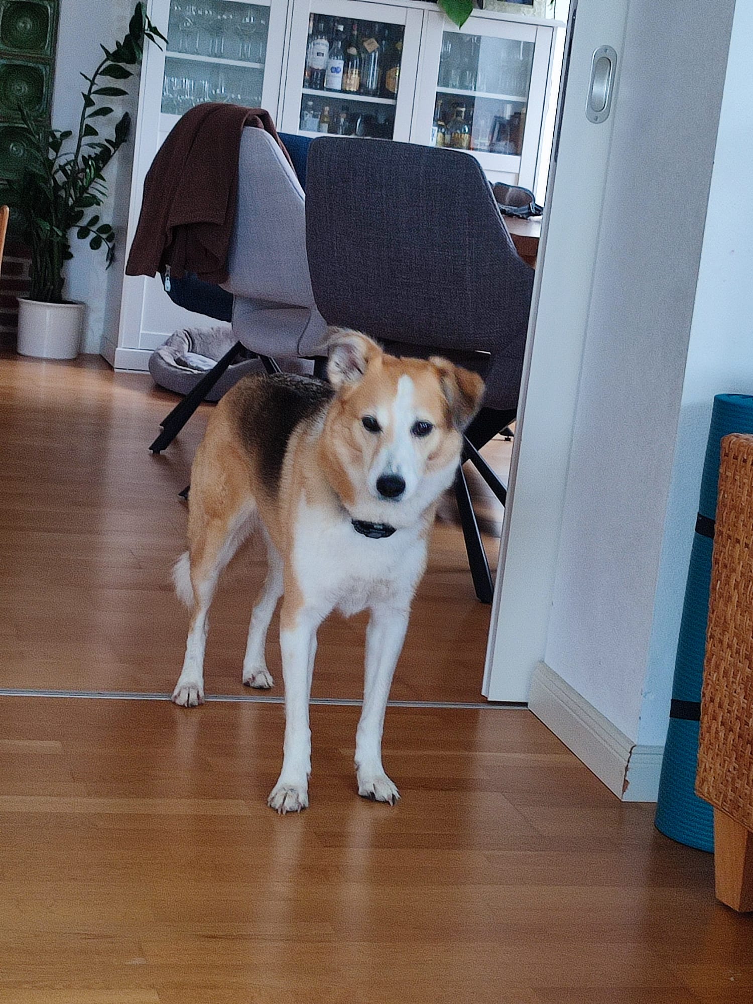 Die relativ kurzen Beine im Vergleich zur Körperlänge, die Ohrenform und die Gesichtszüge lassen auf eine Mitwirkung eines Corgis schließen. Auch die gedrungene Körperform und das aufmerksame Wesen sind typisch für Corgis.