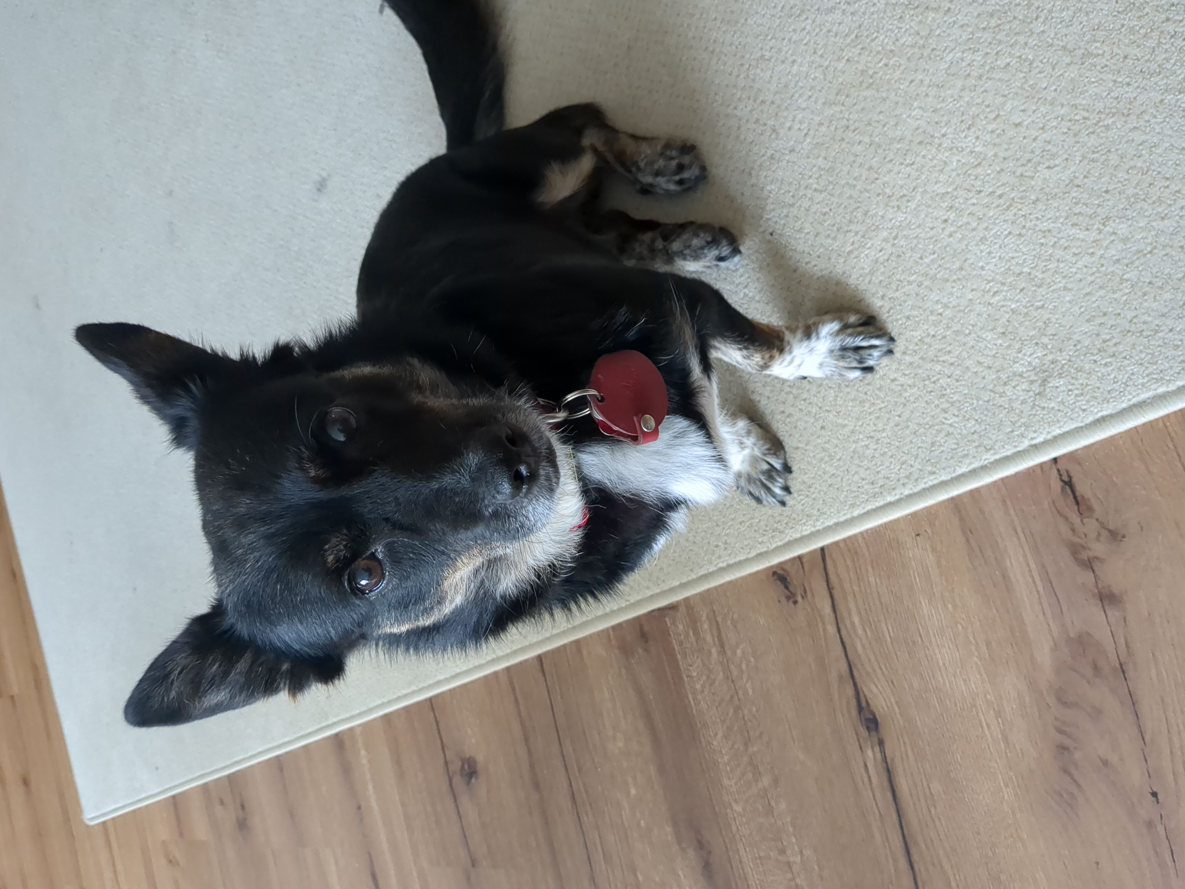 Die gesprenkelte Fellzeichnung an Beinen und Brust sowie die robuste, muskulöse Erscheinung deuten klar auf Einflüsse vom Australian Cattle Dog hin. Auch das dichte, glatte Fell passt gut zu dieser Rasse.