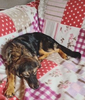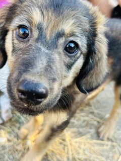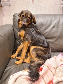 Das Fellmuster, insbesondere die schwarz-braune Sattelzeichnung, sowie die Körperform mit dem muskulösen und etwas länglichen Körperbau erinnern stark an den Deutschen Schäferhund. Auch der Gesichtsausdruck sowie die Ohrenform deuten auf diese Rasse hin.