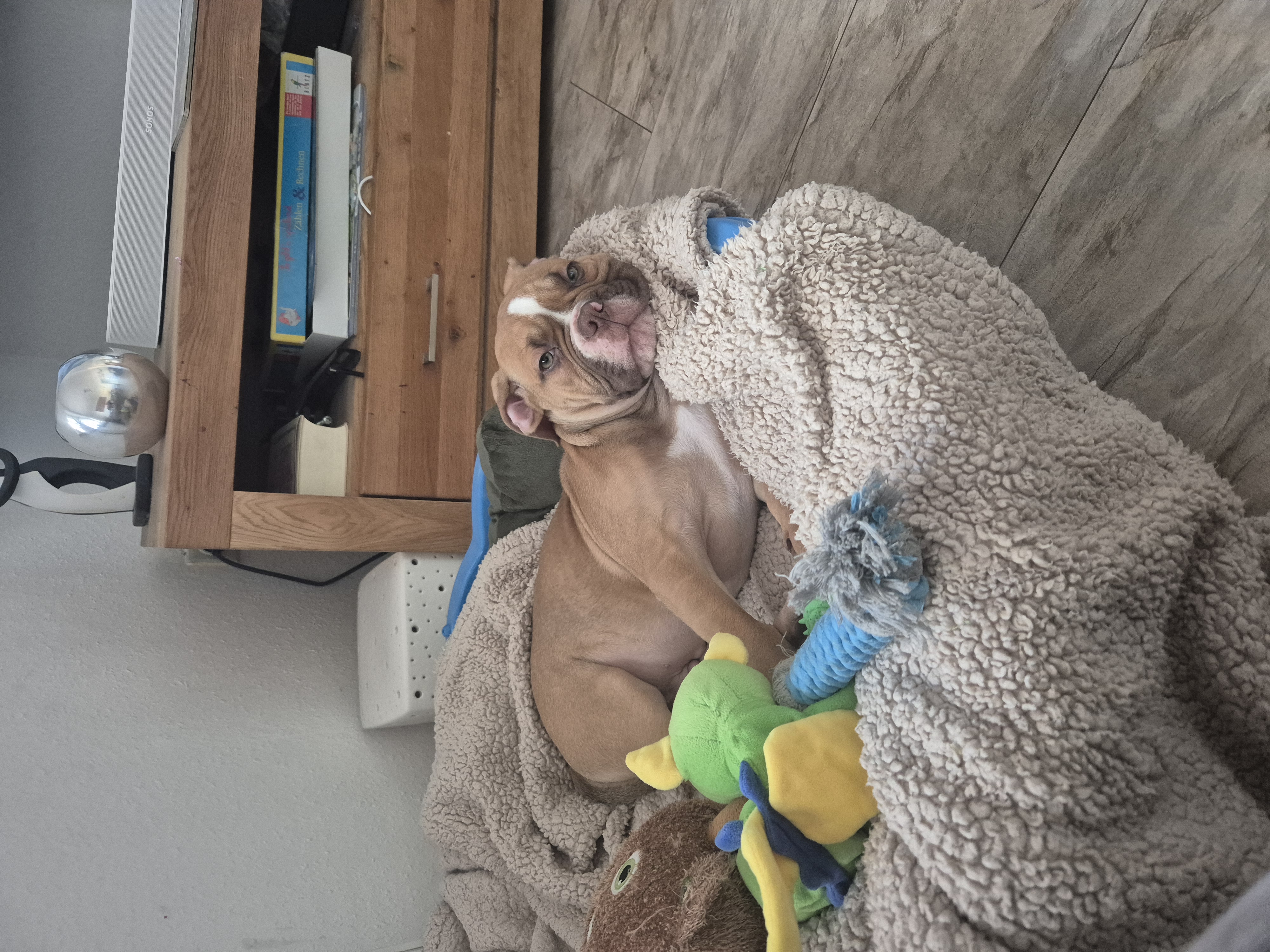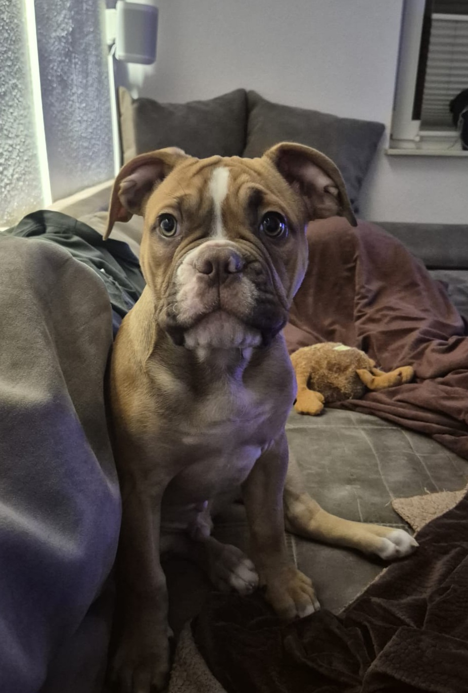 Die Kopfform mit der etwas längeren Schnauze als bei einer reinen Bulldogge, die Ohrenform sowie der athletischere Körperbau im Verhältnis zur Körperlänge lassen Rückschlüsse auf Boxer-Anteile zu. Auch die Fellfarbe passt gut zum typischen Stromungs- oder Rotstich des Boxers.