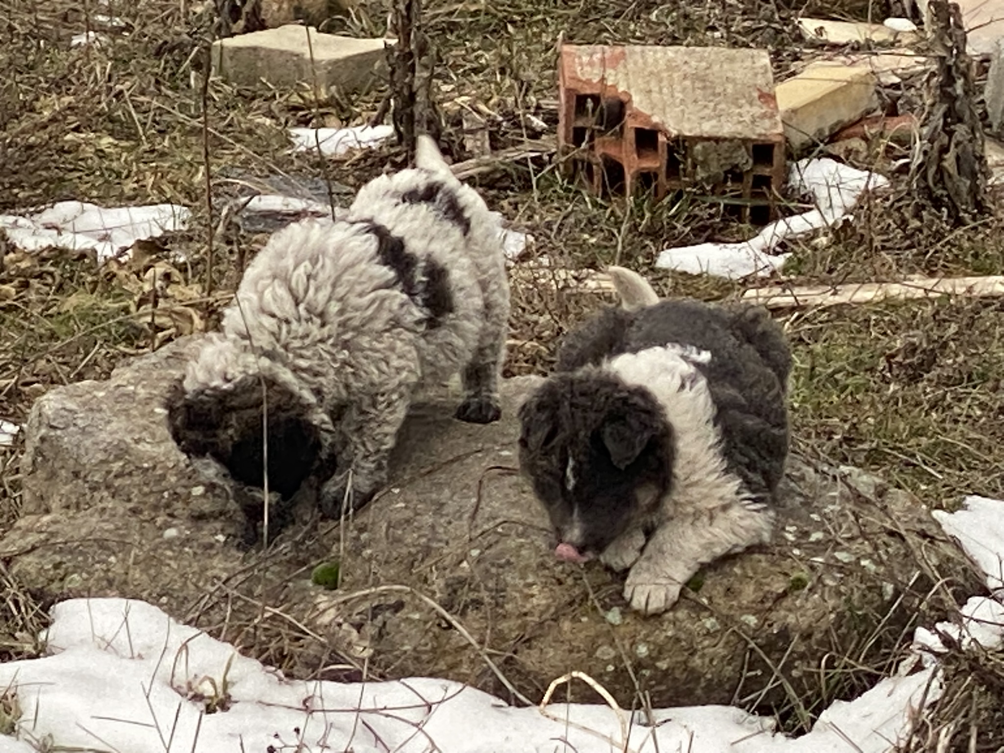 Das lockige, dicht gelockte Fell mit Flecken erinnert stark an den rumänischen Mioritic Schäferhund. Diese Rasse ist bekannt für ihr auffällig wolliges Haarkleid und ihre Schutzinstinkte – die Musterung und Fellstruktur passen gut zur Erscheinung einiger Welpen hier.