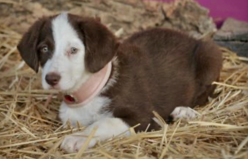 Der Hund zeigt typische Merkmale eines Border Collies: die mittlere Größe, das dichte Fell mit braun-weißer Zeichnung, sowie die markante Blesse auf der Stirn. Auch die intelligent wirkenden, leicht mandelförmigen Augen – darunter ein helles, was für Merle-Anlagen spricht – deuten auf diese Rasse hin.