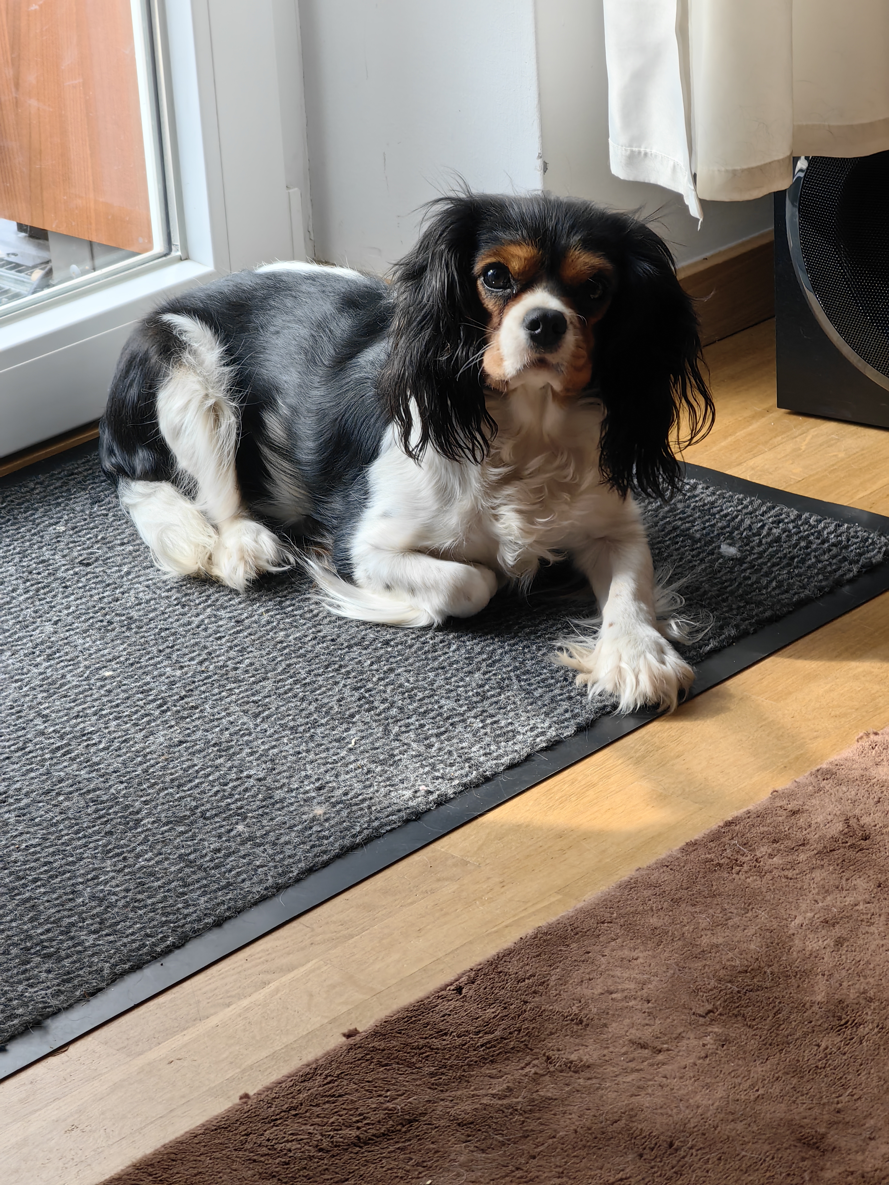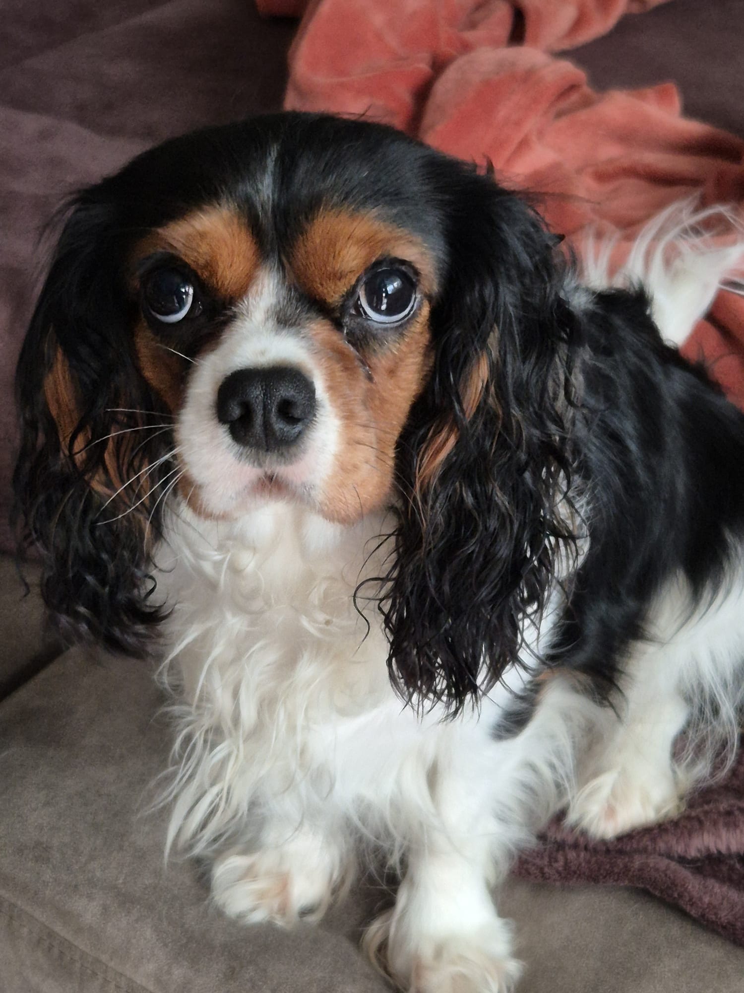 Der Hund weist sehr typische Merkmale eines Cavalier King Charles Spaniels auf: Die längeren, welligen Ohren, das auffällige Tricolor-Fell (schwarz, weiß, braun), die runden, glänzenden Augen und der kompakte Körperbau mit leicht gewelltem Fell. Auch die proportionierte Schnauze und der sanfte Gesichtsausdruck sind rassespezifisch.