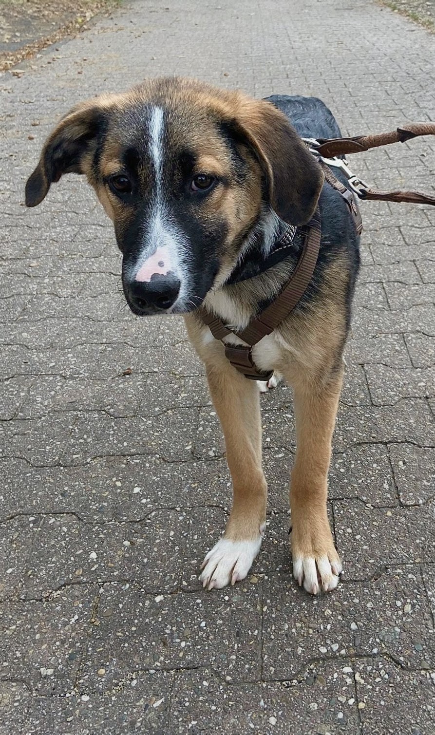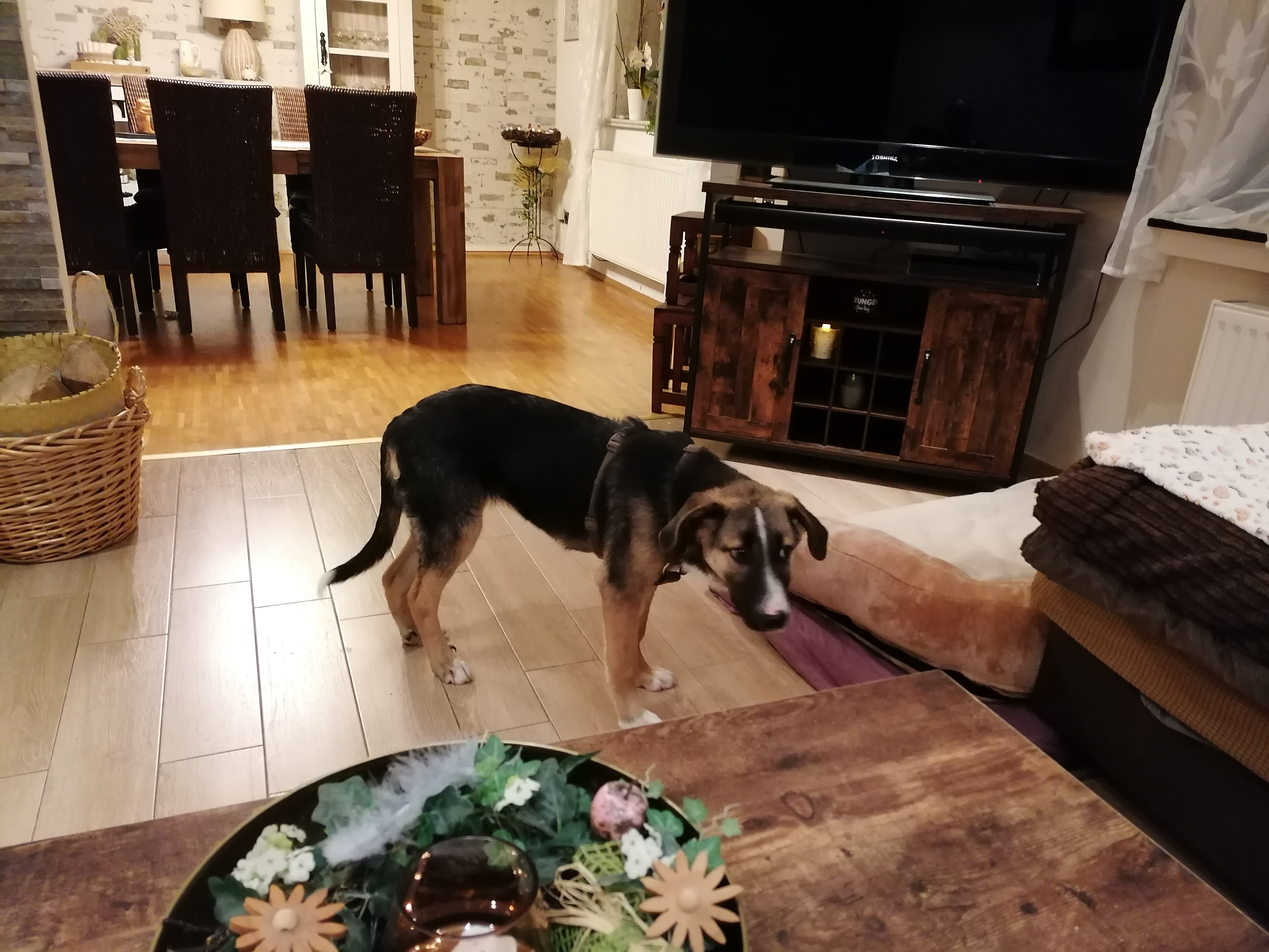 Der insgesamt eher freundliche Gesichtsausdruck, die Form der Ohren sowie der kräftige Körperbau könnten auf einen Labrador-Anteil hindeuten. Auch das Verhalten auf den Fotos (entspanntes Liegen auf dem Sofa) passt gut zu dieser Rasse.