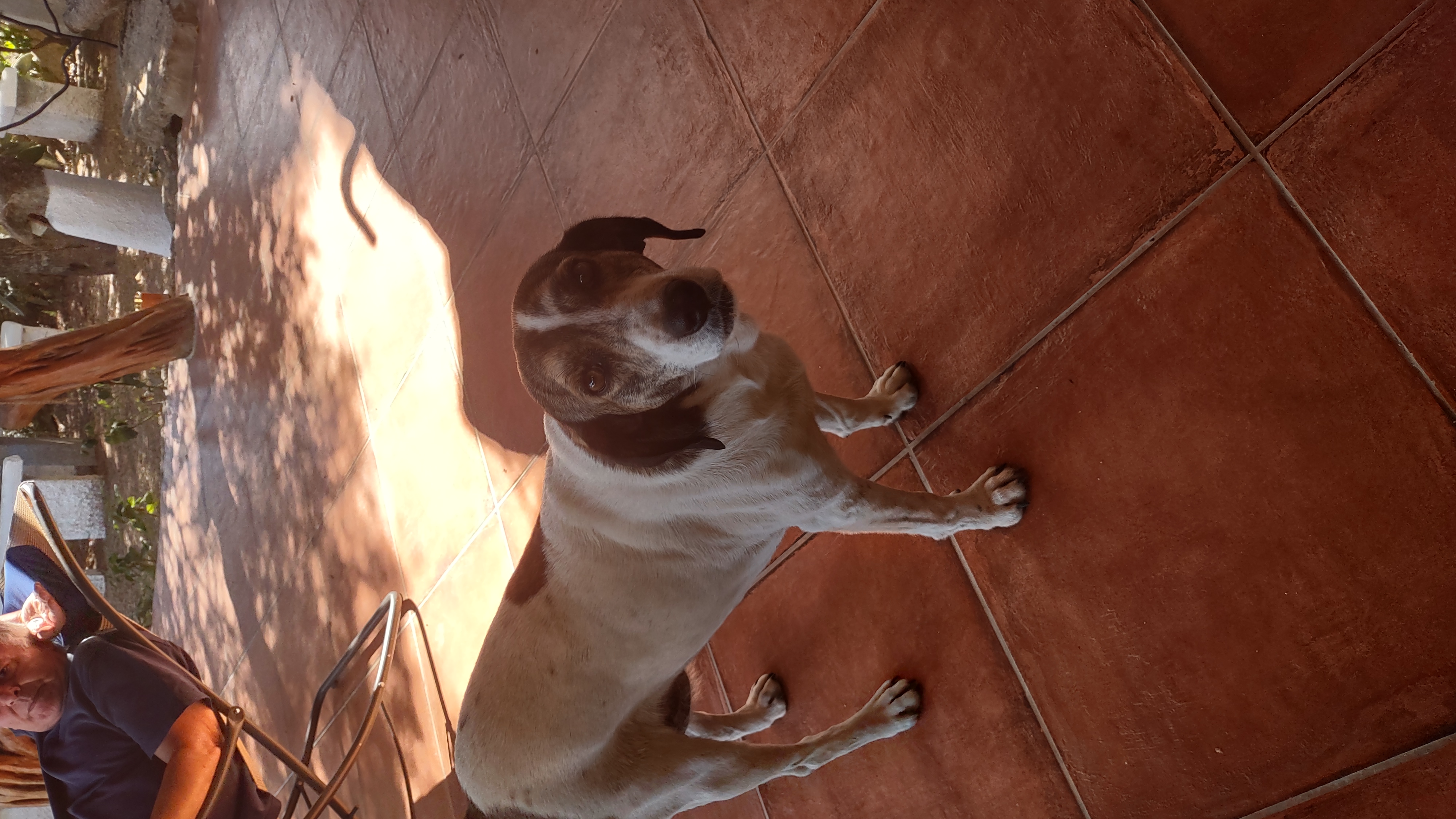 Die Fellfarbe und der kräftige Brustkorb lassen auf eine mögliche Labrador-Einmischung schließen. Labrador-Mischlinge zeigen häufig diese Körperform in Kombination mit kürzerem Fell und gutmütigem Gesichtsausdruck, was hier ebenfalls zutrifft.
