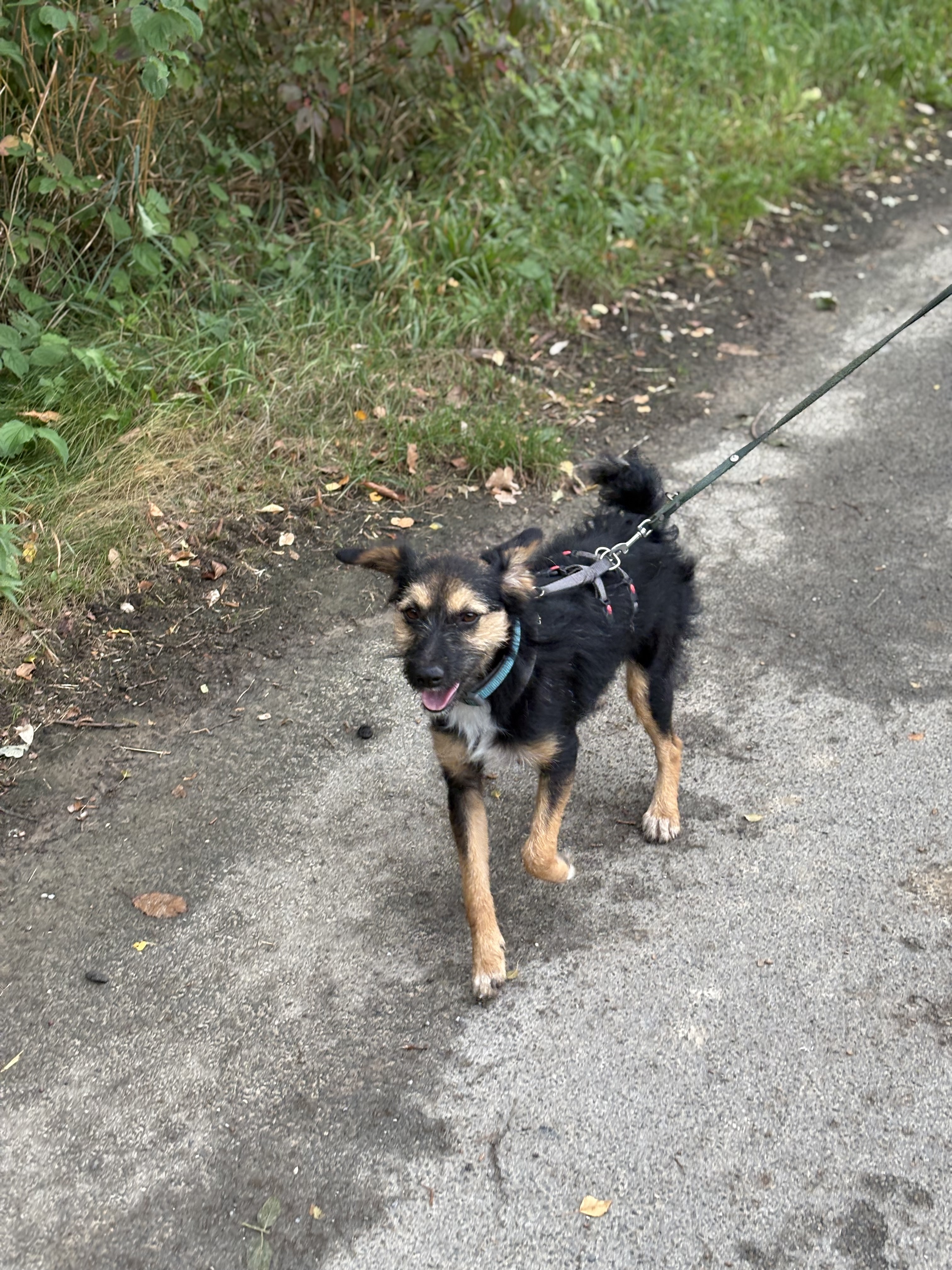 Der Hund hat typische Merkmale eines Terriers: die drahtige Fellstruktur, die aufrechte, leicht spitze Ohrenform, die Körpergröße und der wache, lebendige Ausdruck. Besonders auffällig ist die Fell- und Farbkombination aus Schwarz mit lohfarbenen Abzeichen, ein klassisches Merkmal vieler Terrier-Arten wie dem Deutschen Jagdterrier.