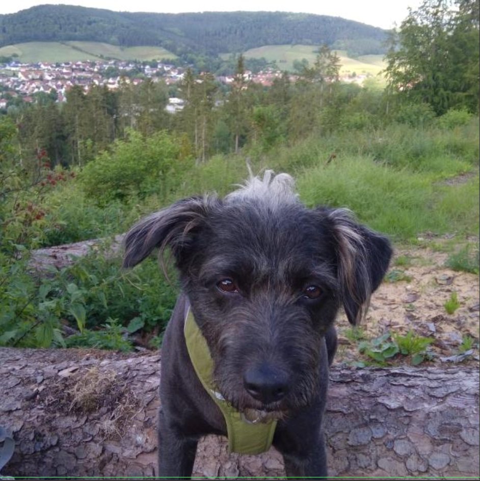 Die markante Gesichtsbehaarung mit ‚Bart‘ und buschigen Augenbrauen, das drahtige Fell sowie die aufrechte Haltung deuten stark auf einen Schnauzeranteil hin. Auch die schwarze Fellfarbe mit etwas Grau/Weiß passt gut zu dieser Rasse.
