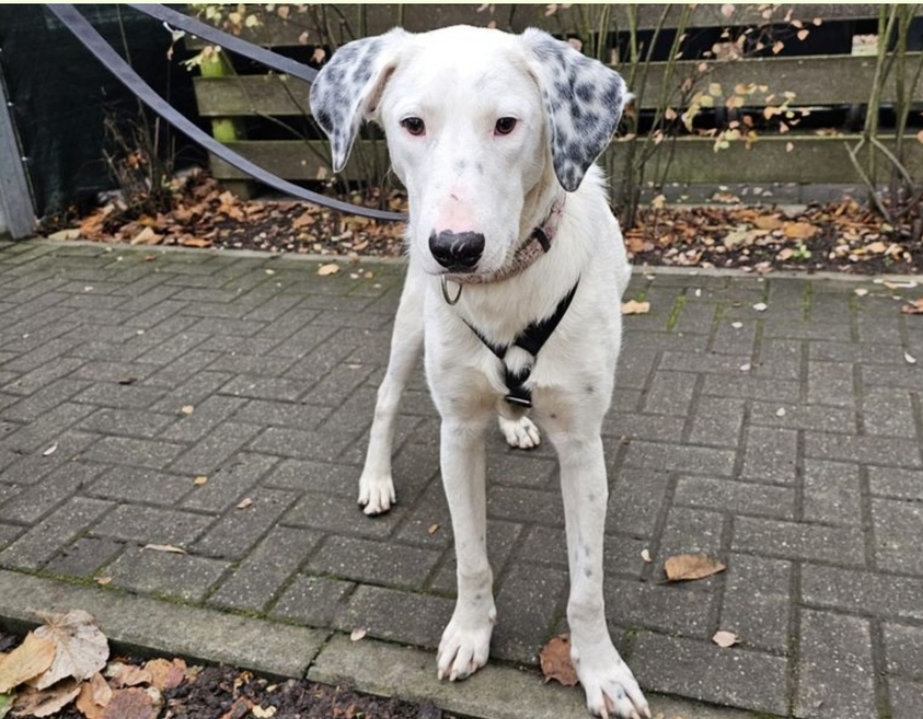 Der Hund zeigt deutlich erkennbare Merkmale eines Dalmatiners, insbesondere das weiße Fell mit schwarzen Punkten auf den Ohren und an einzelnen Körperstellen. Auch die Kopfform und der Ausdruck erinnern stark an diese Rasse.