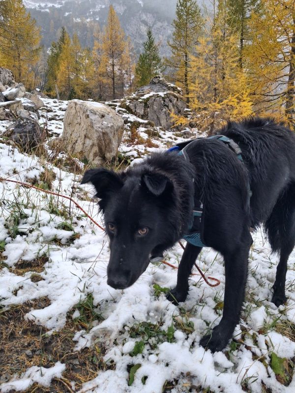 Das durchgehend schwarze, glänzende Fell mit mittlerer Länge sowie die etwas weicheren Gesichtszüge weisen auf eine genetische Beteiligung des Flat-Coated Retrievers hin. Auch das noch jugendliche Gesamtbild passt zum Einfluss dieser freundlichen Rasse.