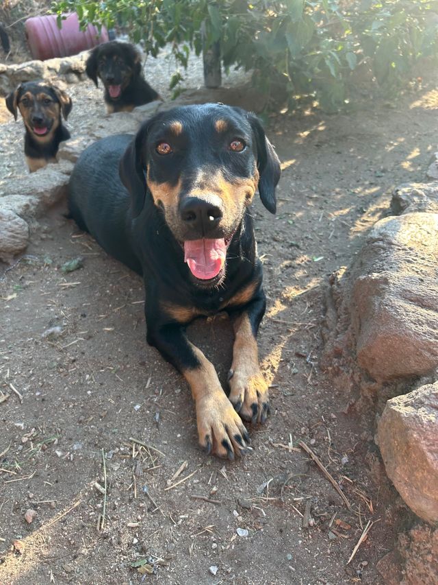 Die Fellzeichnung des Hundes, besonders das Schwarz mit klar abgegrenzten lohfarbenen (beigen) Abzeichen an Augen, Fang, Brust und Beinen, ist sehr typisch für einen Rottweiler. Auch die Körperform mit dem robusten, muskulösen Körperbau spricht für einen deutlichen Anteil an Rottweiler-Genetik.
