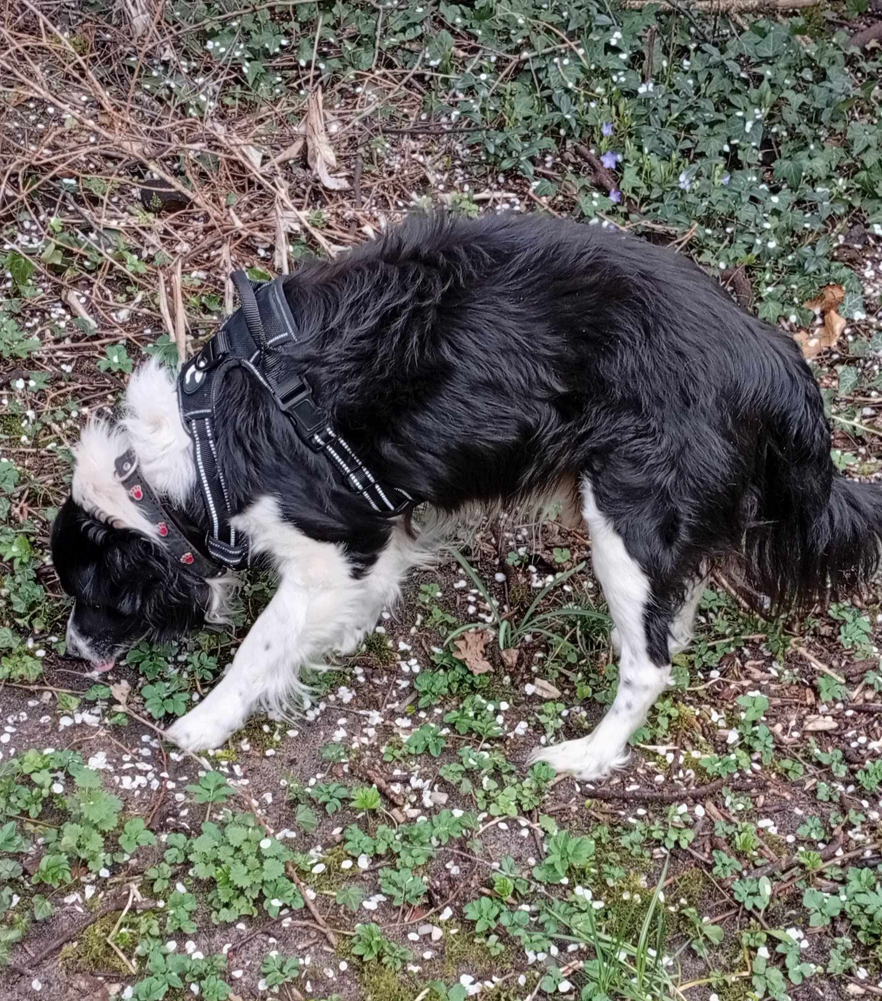 Die Körperform, das leicht gewellte mittellange Fell, sowie die schwarz-weiße Fellzeichnung mit weißer Blesse sind stark typisch für einen Border Collie. Auch das konzentrierte Suchverhalten spricht für einen Hütehund wie den Border Collie.