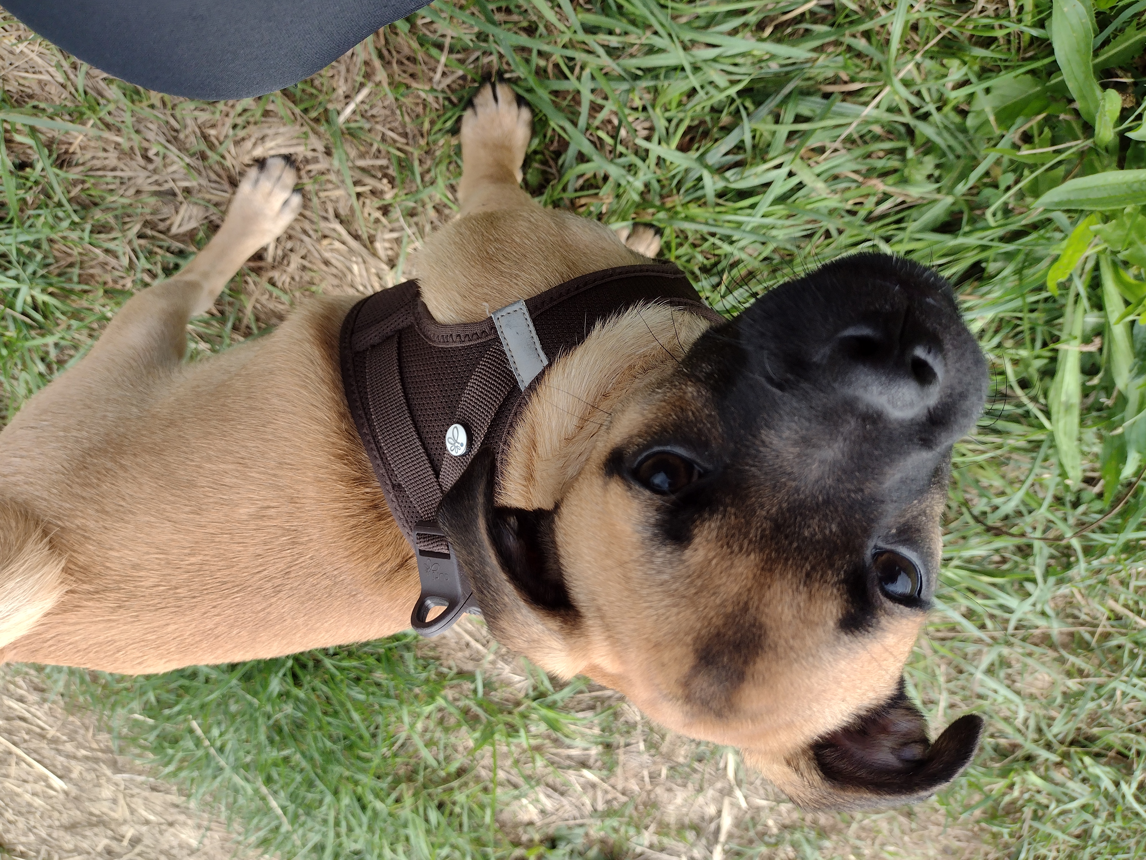 Der Hund zeigt die typischen körperlichen Merkmale eines Mopses: das kurze Gesicht mit flacher Nase, die großen, runden Augen, die kleine Körpergröße sowie die eingerollte Rute. Auch die Färbung im Gesicht (schwarz) ist ein häufiges Merkmal beim Mops.