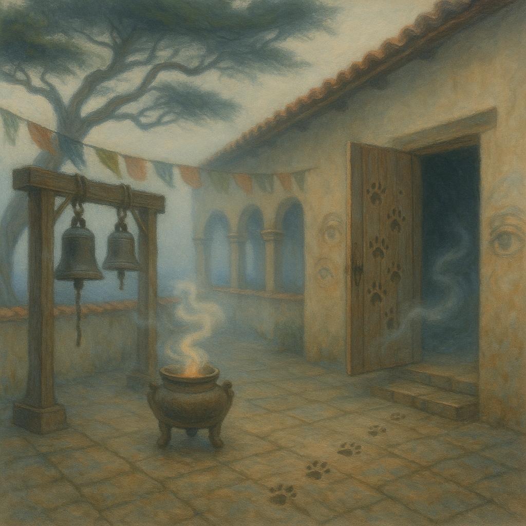 Great bells tolled over the cliff monastery as Wangdu, a fourteen year old Lhasa Apso, padded through incense fog. He remembered every prayer flag’s fray, every hidden stair. The novices whispered he could smell tomorrow. They were right. In the abbot’s cell he sensed the air ripple like silk underwater. Fresco eyes blinked, though stone cannot blink, and ancient vow stirred inside his bones. In the courtyard a door that had never existed resolved from mist, carved with pawprints older than the mountain. The abbot reached for the latch, smiling. Wangdu barked once, warning, as it swung inward to reveal
