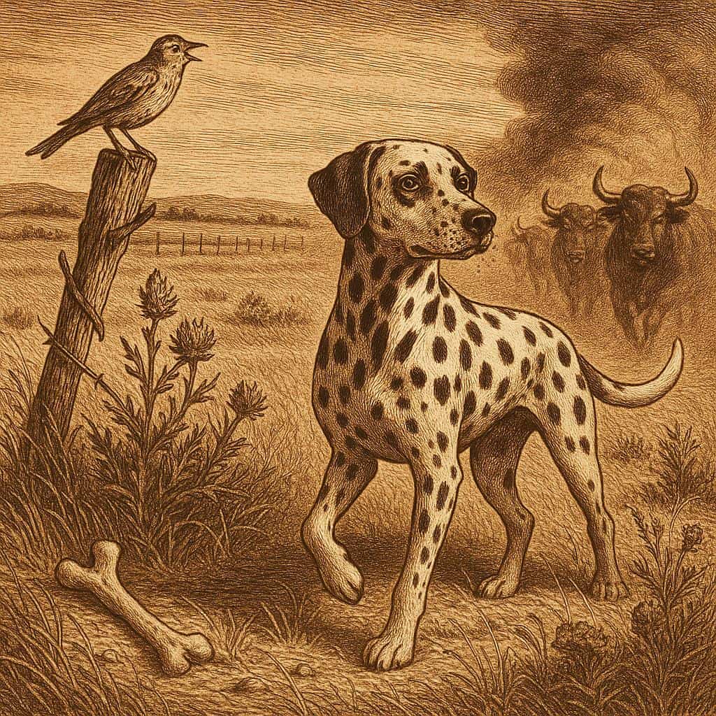 Fritter crumbs freckled Huckleberry’s muzzle as he surveyed the prairie like a retired sheriff. At fourteen, the Dalmatian believed the wind existed mainly to deliver snack smells. He padded past sage and sun bleached bones, thinking the horizon was just a long, flat nap. A meadowlark heckled him; he heckled back with a wheezy bark and a jaunty wag. Then the ground hummed. Dust lifted in a long brown ribbon. That is not a nap, he thought, ears pitching forward as a shadow rolled over him and something huge thundered straight at him.