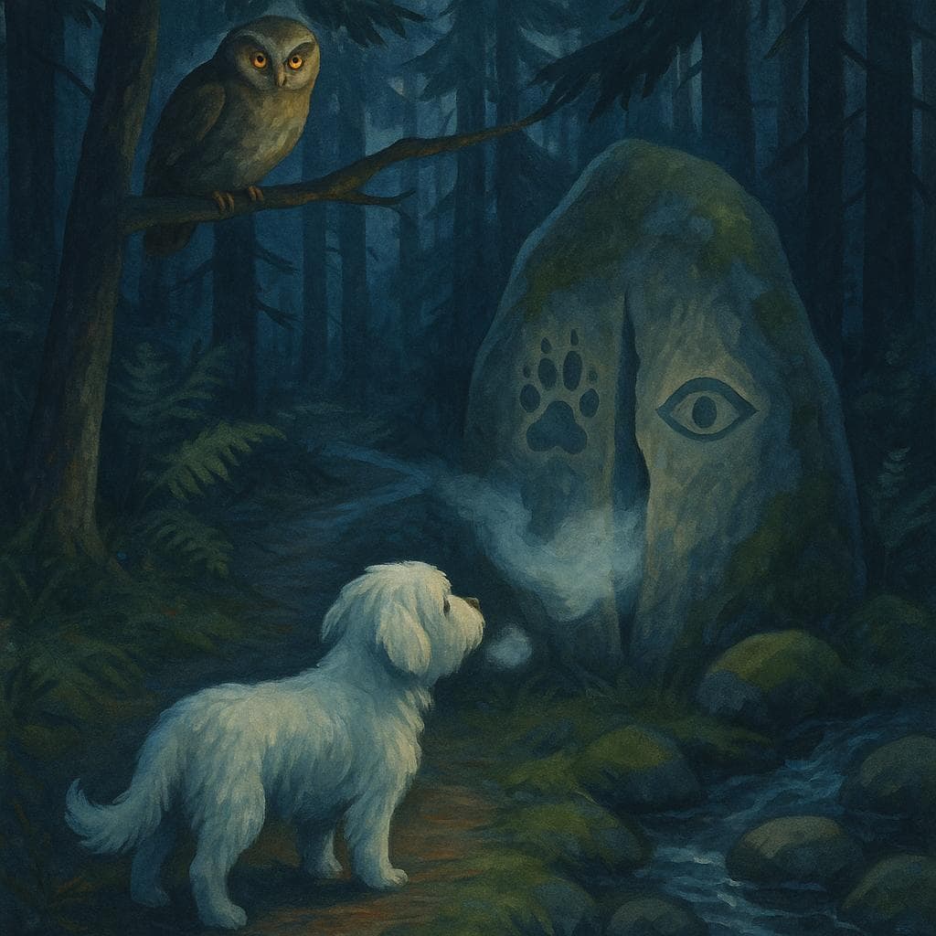 Moonlight threaded the pines as Frost, a fourteen-year-old Maltese, moved with careful grace. He felt his hips ache, yet he welcomed the hush, for the forest kept secrets and he had come to ask for one. Owls watched, amused, knowing he had walked these paths in younger days. The creek spoke in riddles. Frost paused where moss veiled a stone carved with a paw and an eye. He remembered the legend, and the legend remembered him. From the dark behind the stone came a breath, and then the stone slid aside.