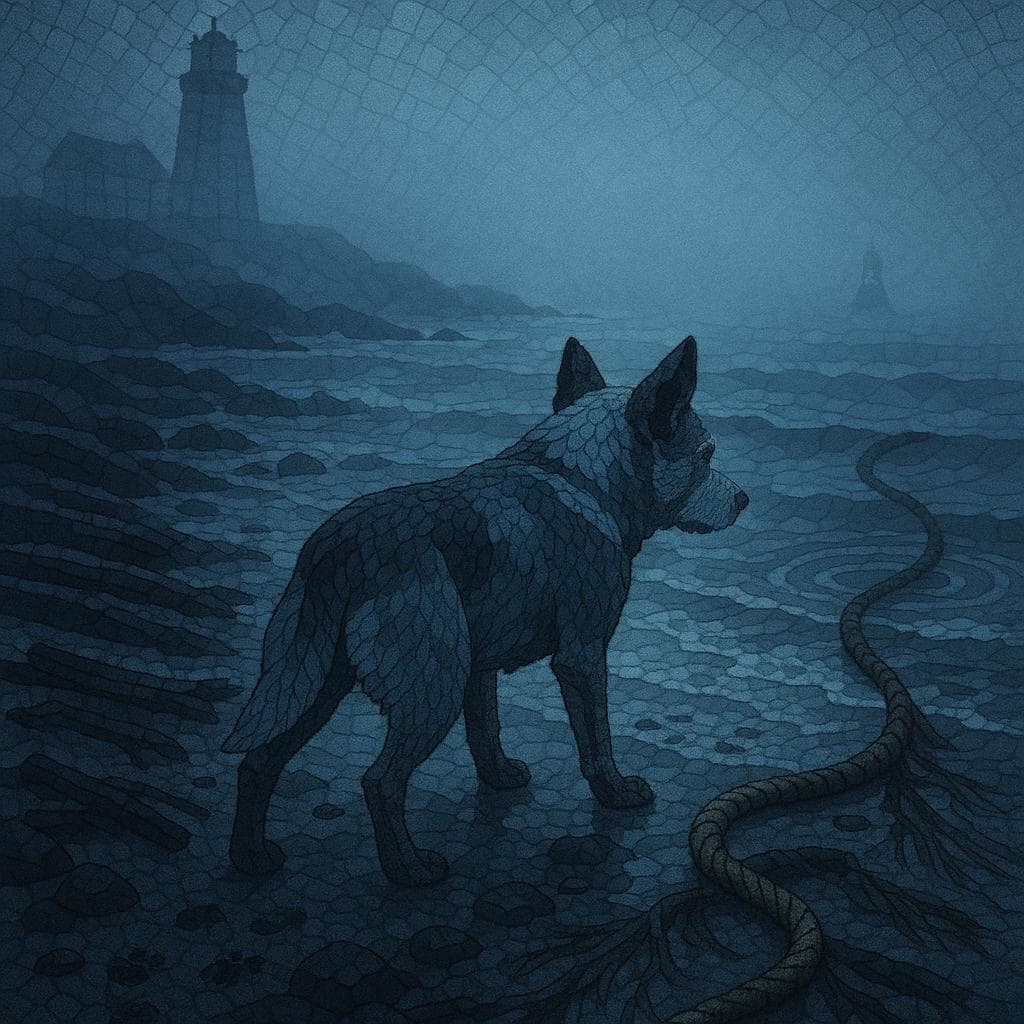Night fog pressed inland as Faro, a fourteen year old Australian Stumpy Tail Cattle Dog, paced the empty shore. Salt and tar snagged his nose; the tide whispered secrets he almost remembered. The lighthouse stood dark, a black tooth. He paused, ears flicking at a faint bell no human would hear, coming from beyond the reef. Old bones ached, but the pull was older. He traced the scent ribbon to a half buried rope coiled like a snake, wet and shivering. Something tugged back. The fog throbbed. Faro growled, digging in. Rope tightened, and a pale hand broke the surface.