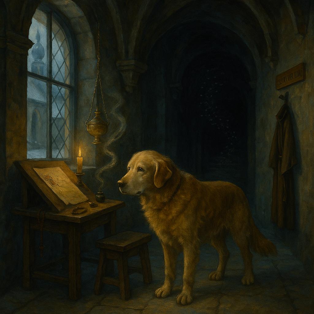 Hushed bells shook the old stones as Kestrel, a Golden Retriever now fifteen years old, padded the cloister. Incense breathed through the arches, and he followed a thread of scent like a golden ribbon only his muzzle could see. Brother Mateo had vanished before lauds, and Kestrel felt the absence like an empty bowl. The old dog nosed the scriptorium door. Glyphs on a half lit page rippled, lifting like small birds. He whined, remembering younger paws, then stepped closer. The letters wheeled into a spiral and the door clicked behind him. From the dark stair, a voice whispered, „Kestrel?“