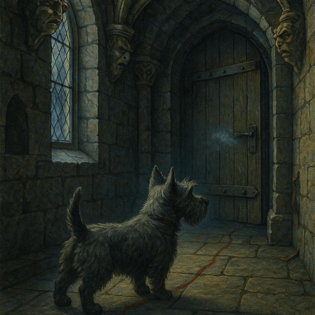 Grim gargoyles watched as Duncan, a fourteen-year-old Scottish Terrier, nosed through the draughty keep. He once patrolled these corridors beside a boy who is now a lord far away; tonight, the wind plays that memory for him like a flute. I can still smell the kitchens, he thinks, and the ash, and her ribbon. Age weighs his joints, but pride lifts his tail as he follows a thin metallic scent toward the chapel door. It is fresh. It is wrong. The door shivers under his nose, unlatching by itself, and from the dark comes a whisper only dogs hear: Duncan.