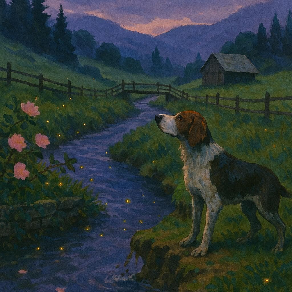 Beneath the violet hush of the valley, Brio, a thirteen-year-old Brittany, lifted his nose to the scent of rain and wild roses. The roses meant her, the memory his man wore like a second heartbeat. Brio’s hips ached, yet he trotted on, following the ribbon of perfume along the stream. Fireflies stitched gold between reeds; he felt the old pull of matchmaking, the work he loved. A shadow paused on the far bank, a woman-shaped stillness, and her whisper brushed his ears. He barked once, joyous, then the earth at the water’s edge shuddered and crumbled under his paws.